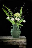 Breng de essentie van een vroege lentemorgen in uw interieur met deze wanddecoratie. Op de foto is een sierlijke groene vaas te zien die staat op een ruwe houten bank. De vaas is gevuld met wilde takken en groene en witte bloemen, die samen frisse sfeer geven. De witte bloemen zorgen voor puurheid en eenvoud.