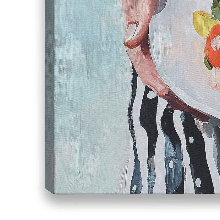 Frisse Salade | Salade Kunst - Dit voedsel schilderij toont een heldere en kleurrijke salade met kerstomaten en groene kruiden op een wit bord dat vastgehouden wordt door iemand in een zwart-wit gestreepte schort tegen een lichte achtergrond.