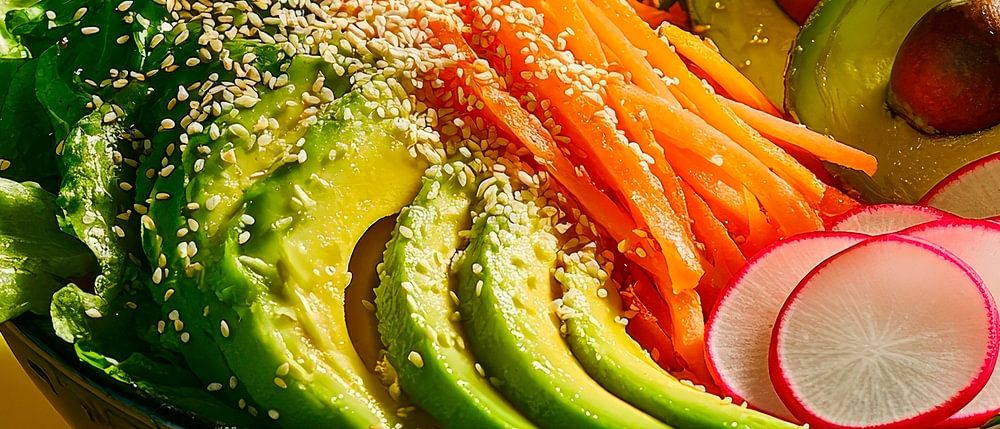 Frisse kleuren en knapperige texturen dansen in een elegante schaal, terwijl felgroene avocadopuree en delicate plakjes radijs harmonieus samengaan. Dit smakelijke arrangement straalt vitaliteit uit en is uitermate geschikt voor in de keuken, waar het inspireert tot gezond eten en culinaire creativiteit.