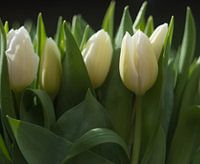 Fresh white tulips high on the photo on a row with a black background. Sunlight shines a bit over the top off the flowers.
