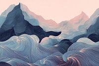 From Sea to Summit verbeeldt een vloeiende reis van water naar hoogte. Langs een verticale as veranderen gestileerde oceaangolven geleidelijk in abstracte bergcontouren. De overgang is naadloos en rustig, alsof zee en berg twee uitdrukkingen zijn van dezelfde vorm. Beweging wordt langzaam stabiliteit.