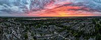 Een luchtfoto van Nieuwegein met op de achtergrond de Nedereindse plas, oftewel de Put van Weber, tijdens een zonsondergang.