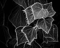 Gedetailleerd overzicht van bevroren bladeren tijdens een koude mistige dag in Midden-Duitsland