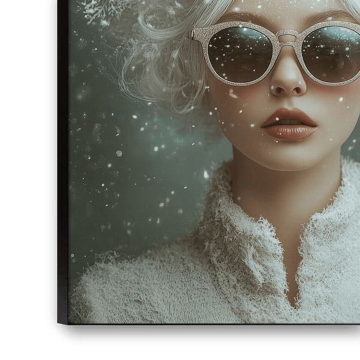 Ze draagt een witte, wollige jas, rijk in textuur, die haar omhult als een wolk van zachtheid. De stof vangt het licht en breekt het in tinten van crème en ijsblauw. Op haar gezicht rust een sparkling zonnebril in zilver, die het winterse licht vangt en terugkaatst in duizenden kleine schitteringen — als ijs dat de zon kust.