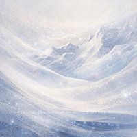 Frozen Horizon is een abstract winterlandschap waarin bergvormen zacht opdoemen door lagen van ijs en sneeuw. De compositie bestaat uit vloeiende, bijna transparante bewegingen die doen denken aan wind die over een bevroren landschap glijdt.