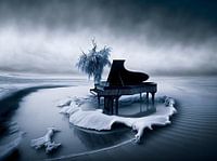 Landschap met een piano in de sneeuw op een bevroren meer.