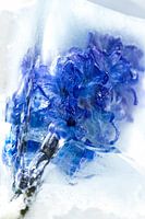 Een blauwe hyacint vast in een blok ijs. De stengel zit nog aan de bloem vast. Om en op de bloem zitten belletjes. De bloem wordt gereflecteerd in het ijs.