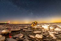 Een bevroren Waddenzee met allemaal ijschotsen endaarboven de melkweg