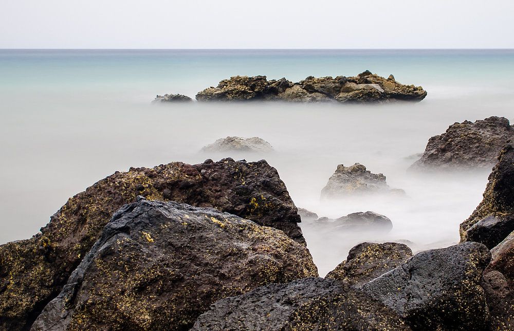 een lange sluitertijd afbeelding van de kust van Fuerteventura, met zicht op de atlantische oceaan.