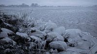 Te zien is de bevroren waterkering van het meer. In het meer ligt sneeuw ijs. Foto is een beetje mistig. Wel zie je de overkant van het meer met bomen.