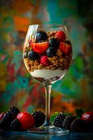 Een verleidelijk glas gevuld met kleurrijke bessen en knapperige muesli ontvouwt zich tegen een levendige, abstracte achtergrond. De frisse kleuren en het smakelijke arrangement geven elke kamer een vrolijk tintje en nodigen uit om te genieten. Ideaal voor in de keuken of eetkamer, waar genieten en creativiteit hand in hand gaan.