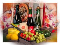 Close-up van druiven, frambozen, tomaten, citroenen en drank in een keuken arrangement.