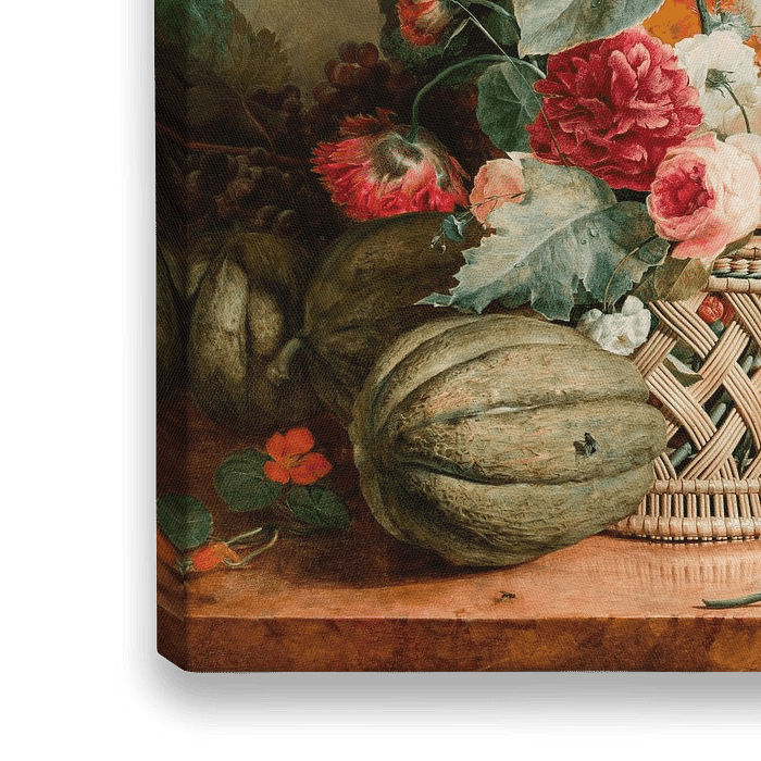 Elk onderdeel kan nauwkeurig worden geïdentificeerd. Een klein vliegje heeft zich op de meloen gevestigd, waardoor de voorstelling buitengewoon realistisch is, ook al bloeien de tulpen en klaprozen niet in dezelfde tijd van het jaar.