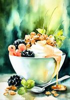 Een gedetailleerde aquarel toont een witte schaal met fruit en noten op een glad oppervlak. Donkere bessen ontmoeten lichtgekleurd abrikoos- of kersenfruit, vergezeld van gedroogde bloemen en delicate groene takjes. Een romige, lichtbruine substantie druppelt zachtjes uit de kom, terwijl er een zilveren lepel naast ligt. De achtergrond…