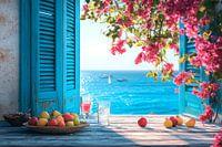 Een romantisch raam opent naar de turkooisblauwe uitgestrektheid van de zee, omlijst door levendige bougainvillebloesems. Een rustieke tafel gedekt met verse, kleurrijke appels straalt gastvrijheid uit. Een glas verfrissende drank schittert in het zonlicht, terwijl het zachte geluid van de golven een uitnodigende sfeer creëert - de perfecte plek voor zoete ontspanning.