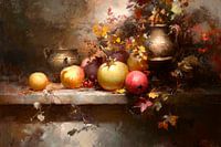 Een samenspel van warme kleuren en zachte lichtaccenten ontvouwt zich op het doek. Sappige appels in verschillende tinten rusten naast elegante vaten, omringd door tere herfstbladeren. Deze stijlvolle compositie nodigt de kijker uit om de zintuigen te prikkelen en te genieten van de tijdloze harmonie van de natuur.
