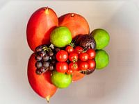 Stilleven met groente en fruit gefotografeerd op een spiegel