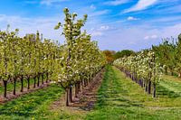 Lente in de boomgaard met appelbomen in een weiland en een blauwe lucht erboven.