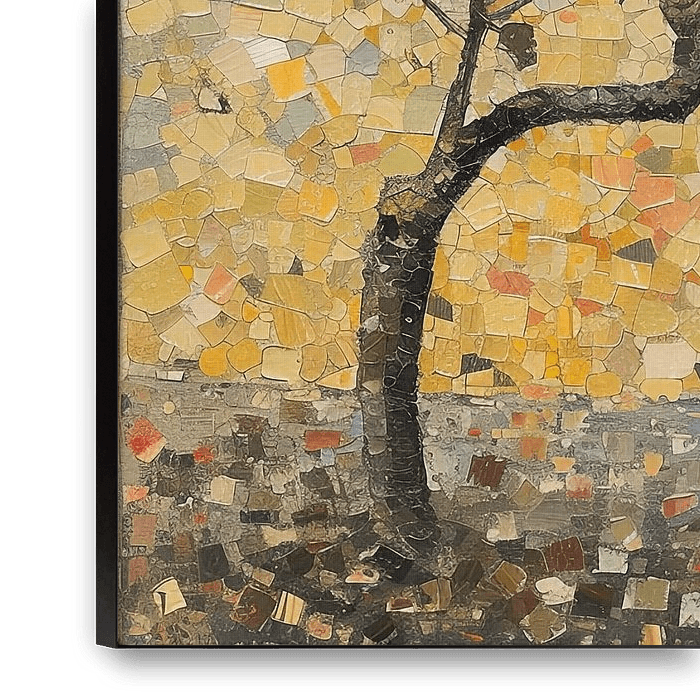 Fruitboom Schilderij | Colors of the Fruitful Tree - Dit fruitboom schilderij toont een sierlijk vormgegeven appelboom, elk blad en elke appel uitgevoerd in een uitbundige mozaïek van veelkleurige vierkante en rechthoekige tegeltjes, waardoor het geheel een rijk en textuurrijk oppervlak krijgt. De boom staat prominent in het midden van…