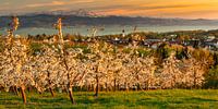 Fruitboom bloesem in Kressbronn met uitzicht op de Zwitserse Alpen met Säntis (2502m), Opper-Zwaben, Baden-Württemberg, Duitsland