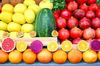 Collage van kleurrijk vers fruit van de groenteboer. Exotische vruchten, granaatappels, sinaasappelen, grapefruits, watermeloen, zoete suikermeloen in felle kleuren. Fruitmarkt, Carmelmarkt (Souk), Tel Aviv, Israël. Mooie decoratie in de keuken.