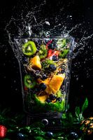 Een dynamische explosie van vers fruit dat danst in een blender creëert een gevoel van vitaliteit en energie. De felle kleuren van de kiwi, ananas en bessen springen meteen in het oog. Dit levendige kunstwerk brengt vreugde en frisheid in elke keuken en inspireert tot gezonde culinaire hoogstandjes.