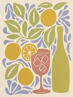 Speelse en levendige compositie waarin citrusvruchten, bladeren, een glas met ijsblokjes en een wijnfles centraal staan. In dezelfde knipkunst-stijl als de vorige afbeelding, straalt ook dit werk een gevoel van eenvoud, plezier en seizoensgebonden overvloed uit. De vormen zijn gestileerd en vlak, wat doet denken aan het werk van…