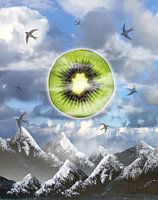 Een berglandschap met een wolkenlucht. In de wolkenlucht hangt een kiwi schijf op de plek waar de zon zou kunnen staan.