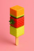 Een kleurrijke en speelse ijstraktatie opgebouwd uit perfect gevormde fruitkubussen van mango, aardbei en meloen. Deze vrolijke compositie op een roze achtergrond straalt zomerse frisheid en creativiteit uit – bijna te mooi om op te eten!