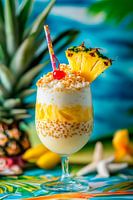 Tropische flair en een vleugje vakantiestemming nodigen je uit om te blijven hangen! Het glanzende cocktailglas, met daarop fruitige ananas en een kers, straalt levensvreugde uit. Deze kleurrijke compositie brengt plezier en frisheid in elke keuken of woonkamer, ideaal voor gezellige avonden of ontspannen middagen. Een echte blikvanger…