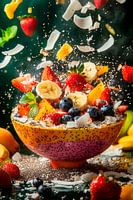 Een uitbarstende verscheidenheid aan kleuren van vers fruit, dat uit een artistieke schaal lijkt te komen, wekt het verlangen naar gezonde verwennerij. De combinatie van banaan, aardbeien en bosbessen, omhuld met kokosschilfers, geeft een gevoel van vreugde en frisheid. Perfect voor in de keuken om een uitnodigende en levendige sfeer te…