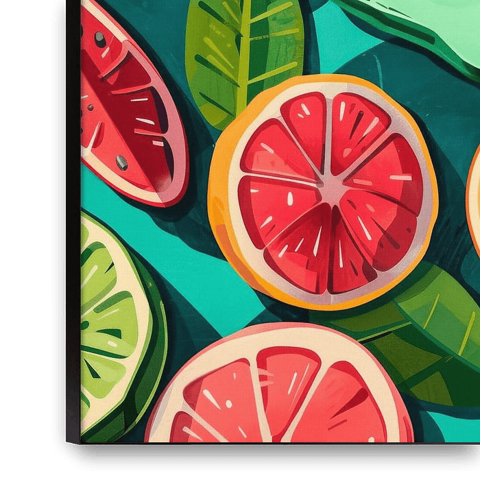 Een levendig assortiment fruit ontvouwt zich op een melancholisch, groenblauw canvas. Sappige limoenen en felgekleurde sinaasappels contrasteren met het zachte groen van een avocado, die op mysterieuze wijze met zijn pit knippert. Geometrische sneden en tropische bladeren geven de compositie een frisse, uitnodigende flair en prikkelen…
