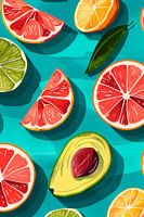 Een kleurrijk ensemble van sappige citrusvruchten en romige avocado strekt zich uit tegen een aquamarijne achtergrond. Intens rood, helder oranje en verfrissend groen harmoniëren en geven de compositie een levendige frisheid. Het artistieke arrangement nodigt je letterlijk uit om je onder te dompelen in een zomerse fruittraktatie en je zintuigen te revitaliseren.