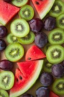 Een levendige compositie van sappige watermeloen, verfrissende kiwi's en dieppaarse druiven voegt een fruitige noot toe aan elke kamer. De heldere kleuren en frisse schikking nodigen uit om ervan te genieten en creëren een vrolijke sfeer. Dit schilderij is perfect voor de keuken of eetkamer, waar het de eetlust stimuleert en een goed humeur verspreidt.