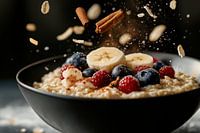 Een heerlijk ochtendmeesterwerk om de zintuigen te prikkelen! Verse bessen en bananenschijfjes dansen in een symfonische lichtheid over romige havermout, terwijl kaneelstokjes een pittige noot toevoegen. Deze levendige kijk op ontbijt geeft energie aan de keuken en inspireert tot even creatieve culinaire hoogstandjes!