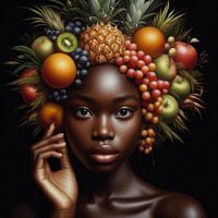 Een realistisch geschilderd portret van een vrouw met een kapsel van verschillende soorten fruit.