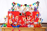 Een verjaardags zoekplaatje van de fubby's. Een feestelijke versierende groep Fubby poppetjes die feest vieren.