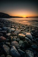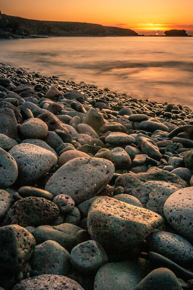 Canarische Eilanden, Fuerteventura. Lange blootstelling op een stenen zandstrand met ronde gewassen lavasteen en uitzicht op de zee. Zonsopgang over de zee aan de horizon. Lange blootstelling