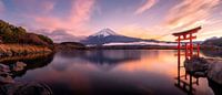 Koop dit landschapskunstwerk Fuji en Torii in het avondlicht van Poster Art Shop op canvas, aluminium dibond, (ingelijste) fotoprint, behang en ArtFrame, op maat geprint in Fine-Art kwaliteit.