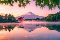 Een majestueuze berg rijst op achter zachte mist, terwijl de kleuren van de zonsondergang weerspiegeld worden in het kalme water. De elegante torii boog voegt een harmonieus, cultureel tintje toe. Dit prachtige kunstwerk brengt rust en inspiratie in elke woonkamer of kantoor, ideaal voor een ontspannen sfeer vol creativiteit.