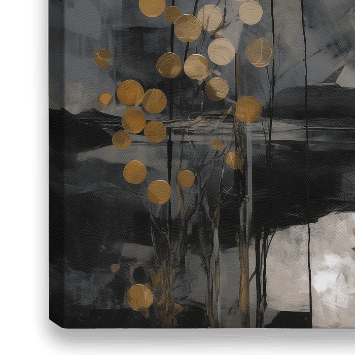 Abstracte kunst in Japandi stijl met grijs,zwart en goud tinten en een grove textuur.