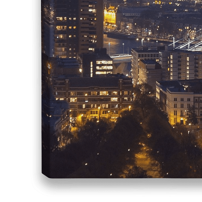 De maan schijnt zijn licht over de skyline van Rotterdam met de Erasmusbrug.