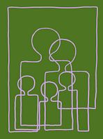 Fullhouse in Olive green/Purple Line, komt uit de serie, familie-lijntekeningen. Deze tekening geeft de bijzonder sterke verbondenheid van een familie weer. Deze personen zijn verbonden door één lijn wat de krachtige band nog meer benadrukt.