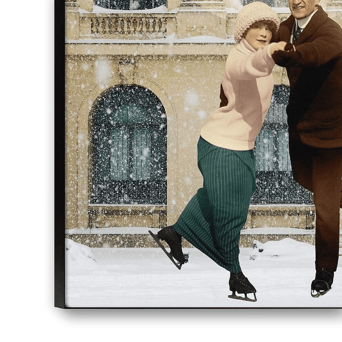 Een nostalgisch winters tafereel, een man en een vrouw, schaatsend op de ijsbaan op het plein van een stad.