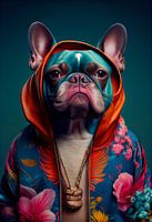 Ontdek de unieke charme van dit absurdistische en humoristische digitale kunstwerk, waar een hond met een uitgesproken gevoel voor mode en een hippe zonnebril in levendige en kleurrijke sportkleding is gehuld.