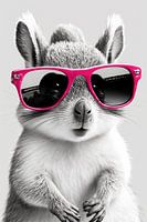 Een schattige eekhoorn in een zwart-witte lijntekening draagt een opvallende roze zonnebril en straalt een funky houding uit. Het originele beeld combineert op charmante wijze natuur en stijl.