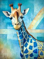 Een giraffe met een kleurrijk en grillig patroon is afgebeeld tegen een geometrische en zacht gemêleerde blauwe achtergrond. De giraffe heeft grote, expressieve ogen en op de achtergrond verschijnt een regenboogelement.