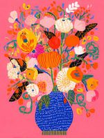 Dit kunstwerk spat van de muur met zijn vrolijke pop-art stijl en explosie van kleuren. In een diepblauwe vaas staan bloemen in oranje, geel, rood en wit, omlijst door speelse groene bladeren. De felroze achtergrond geeft het geheel een eigentijdse en funky uitstraling, waardoor de compositie zowel modern als energiek aanvoelt. Het werk…