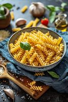 Een kom al dente gekookte fusilli pasta gegarneerd met verse basilicum. Deze klassieke Italiaanse pasta is klaar voor uw favoriete saus of gewoon geserveerd met olijfolie en kruiden.
