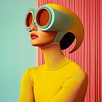 Breng een fascinerende mix van retro-futurisme en kunstzinnige elegantie in je interieur met deze opvallende wanddecoratie. Deze afbeelding trekt de aandacht met haar surrealistische vormen en gedurfde kleurencombinaties. De mysterieuze figuur, gehuld in warme tinten oranje en geel, draagt een bril met opvallende cirkelvormige lenzen en een futuristische helm dat doet denken aan abstracte sculpturen. De vloeiende lijnen en bijzondere vormen geven een bijna buitenaardse charme aan dit kunstwerk, alsof het personage uit een andere dimensie komt waar stijl en kunst samensmelten.